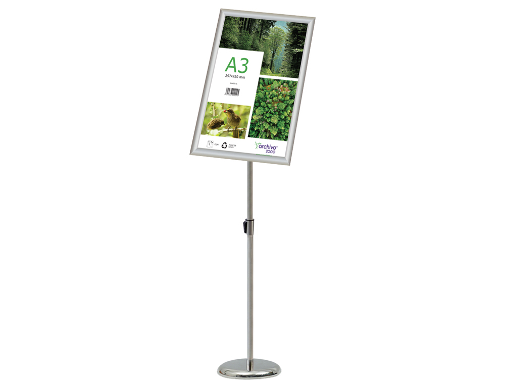 Este atril expositor de pie Archivo 2000, con marco de aluminio, combina funcionalidad, durabilidad y elegancia. Es ideal para entornos donde se requiere una presentación profesional y organizada de documentos o información gráfica. Su diseño regulable en altura y el sistema de fácil apertura Snap Frame permiten una colocación e intercambio rápido de contenidos, asegurando siempre una exhibición clara y efectiva.